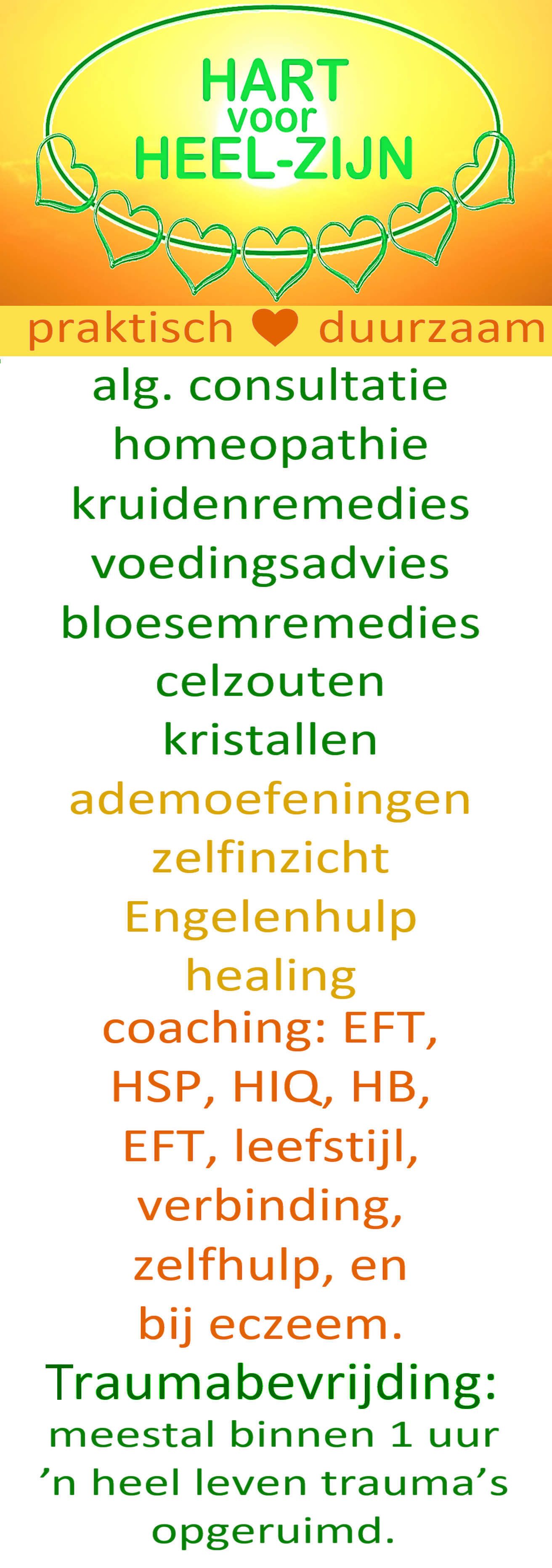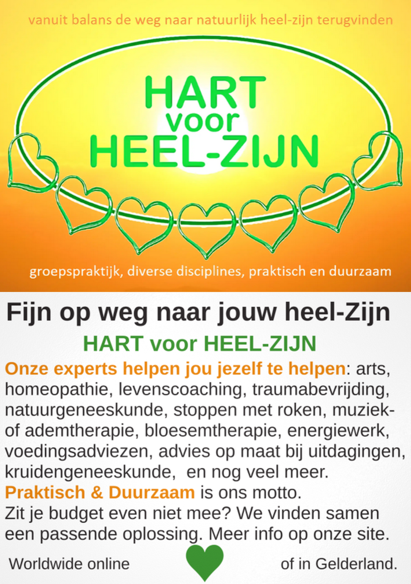 Met HART voor HEEL-ZIJN werken we samen vanuit diverse disciplines. Wil je balans in je leven, de weg naar natuurlijk heelzijn terugvinden? Wees welkom. Geniet de voordelen van onze praktische en duurzame aanpak. Zit je budget niet mee, dan streven we naar een passende oplossing.
