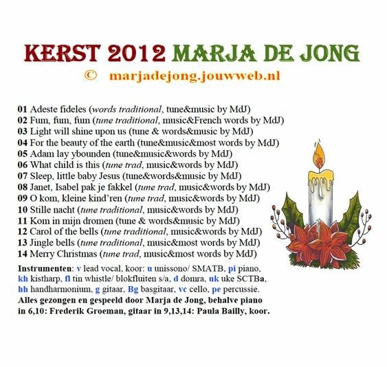 Kerst songs in div. stijlen. Solo, koor, allerlei instrumenten. (14 tr, 55 min.)